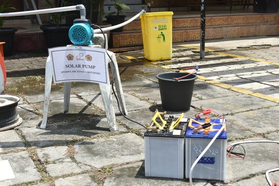 Pompa air ini digerakkan menggunakan listrik bertenaga matahari / surya. Produk ini merupakan hasil karya SMK PN 2 Purworejo.